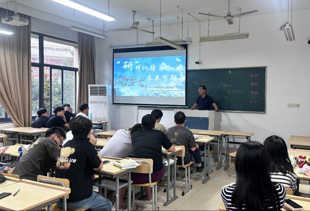 10月16日,水利工程学院2025级水利水电工程(专升本)班在水利机电楼A308举行“研阵以待,未来可期”考研动员会主题班会,学院党总支书记、本科班德育导师陈君,班主任李嗣艺及全班学生参会。