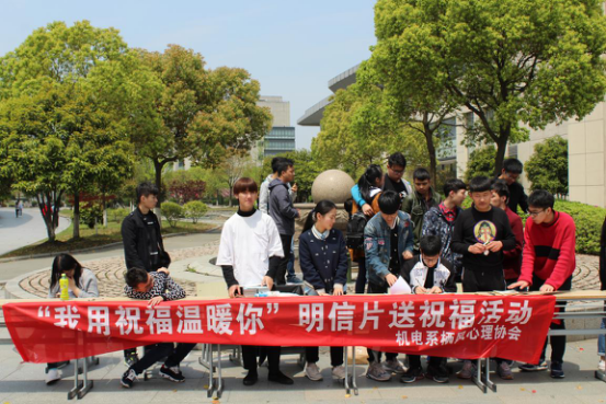 4月12日中午,机电系栖风心理协会联合艺设系学习部在学生食堂门口,举办了“我用温暖祝福你”的明信片送祝福活动,吸引了近千位同学参与,获得了良好的口碑和同学们积极的相应。