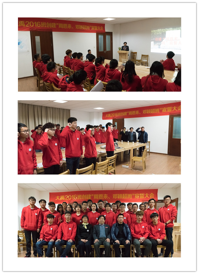在宣誓大会上,全体同学宣读誓言:为立身、立行、立言、立德,大禹2016班级全体学生,立志创建周邓班,秉承“厚德、笃学、修能”校训精神,弘扬伟人思想,践行大禹治水精神,执其器、承其志、治其业,为现代水利发展扬帆起航,为中华崛起励志前行!这铿锵有力的誓词,见证了大家的决心和毅力。