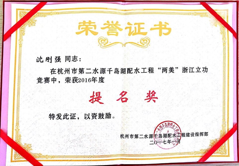 2017年1月20日,大禹公司沈刚强同志荣获由杭州市第二水源千岛湖配水工程建设指挥部颁发的千岛湖配水工程“两美”浙江立功竞赛2016年度提名奖。