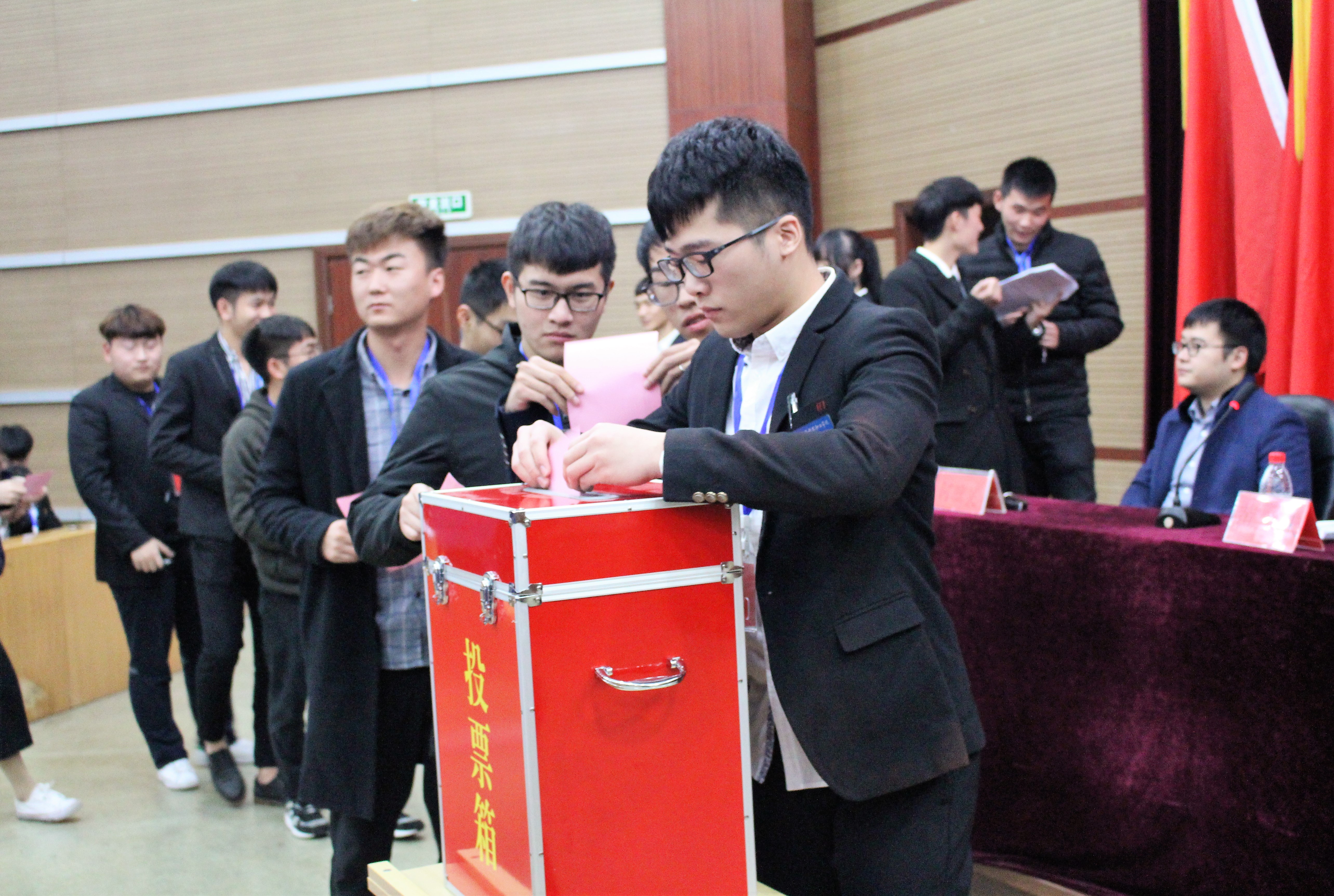 大会在庄严的国歌声中拉开序幕。机电系代理党总支副书记陈安正首先致词,为双代会的胜利召开表示热烈的祝贺,为同学们的辛苦工作表示感谢。同时指出双代会与团学发展有着密切的关系,希望大家起到榜样带头作用,勤奋努力,刻苦学习专业文化知识,在机电系“三修文化”的引领下,做一个品学兼优的优秀大学生。院团委副书记叶乐老师,向大会提出了希望要求,希望大家要有创新思想,切实完善学生自身建设,把握全局,与时俱进,勤于思考,善于创新,开创工作的新局面。随后进入大会的选举阶段,与会的正式代表对候选人进行差额选举,代表们填写完选票后,投出了自己庄严的一票。总计票人金阳和总监票人彭聪二位同学,进行了公正严肃的计票、监票,最后产生20位候选人,由大会执行主席,机电系团总支书记何骥昊老师宣布了候选人名单。在热烈的氛围中,机电系第九次学生代表大会暨第六次学生社团代表大会圆满落幕。