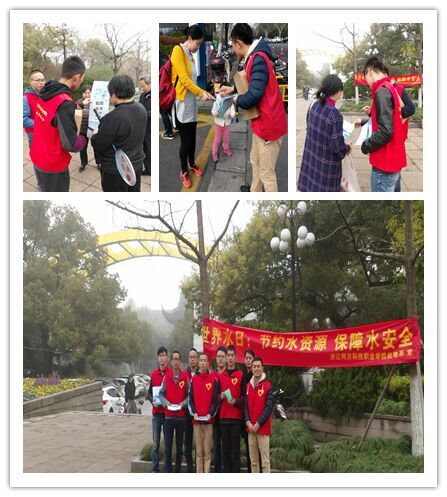 3月22日上午,在机电系党总支副书记蒋晓冬、辅导员符海建老师的带领下,同学们来到了人流密集的西湖边——杭州市青少年活动中心广场开展活动。活动通过赠送宣传纪念品“节水杯”、“公益环保袋”等方式吸引过往的孩子、家长及游客驻足,并利用“节约水资源,保障水安全”的公益手册耐心地向大家宣传日常生活中节约用水的小窍门,普及节水知识。