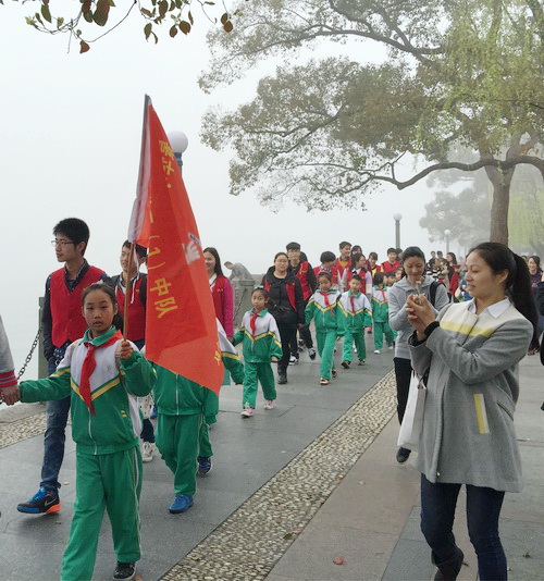 大禹班与景华小学的同学们于早晨8点从湖滨出发,沿南山路-杨公堤-北山路-湖滨路绕西湖环行一周,历时4个小时,毅行10.2公里。一路上大手牵小手,随着旗帜行进,一边向游客分发垃圾袋,一边身体力行捡起路上丢弃的塑料瓶,更有不少游客看到我们的队伍和旗帜之后加入其中。