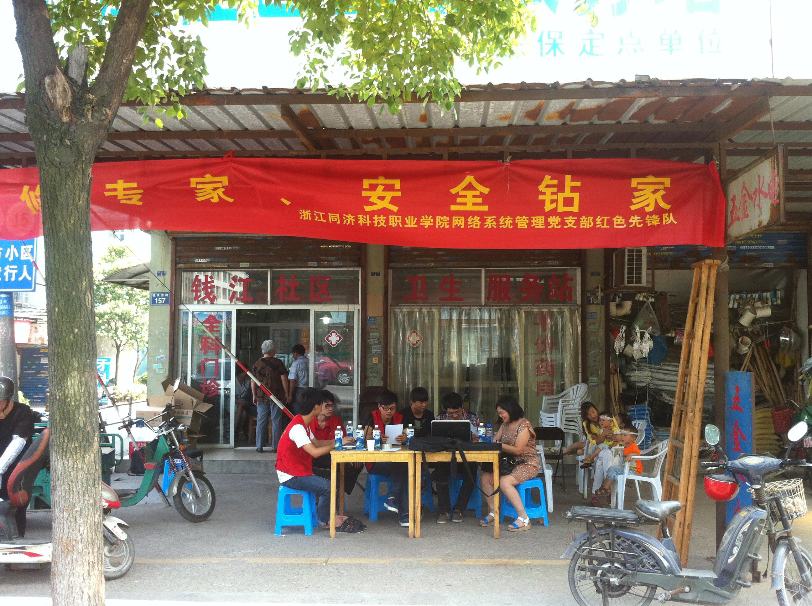 6月13日,信息系网络系统管理党支部师生党员组成红色先锋队前往钱江农场社区,开展对使用电脑的知识宣传以及对社区居民提供计算机问题咨询、维护活动。为了扩大服务面,在小区门口设立维修点,居民可以在维修点进行技术上的询问和计算机的维修;对于电脑不方便带出的,红色先锋队的成员提供免费上门服务,进入居民家中进行计算机维护、维修。