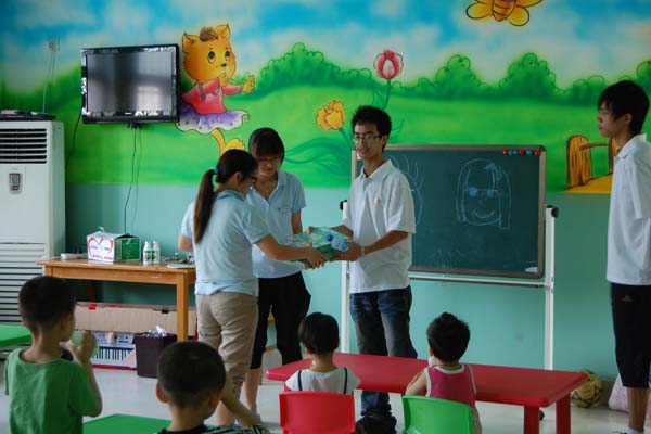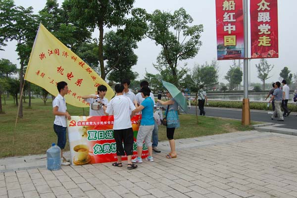在活动期间,队员们怀着无比激动的心情参观了南湖景区和南湖革命纪念馆。在面对红船的瞬间,心中油然产生了一种莫名的情绪,而这种情绪在南湖革命纪念馆里被无限的放大,里面所列的每一件物品仿佛在诉说中国这90年来走过的风风雨雨,也在无形中阐述了一个真理:只有中国共产党,才能救中国。在接下来的几天里,队员们将这满怀的激情地投入到了志愿服务工作中去,在纪念馆广场上举办了以“庆建党九十周年,倡导绿色和谐服务” 为主题的夏日送清凉,免费饮水服务活动,在烈日下为游客、交警、工作人员等送上一份清凉,并倡议人们形成“节水、护水“的良好习惯。此次送水活动虽然只持续了短短两天,但惠及上千人,受到了大家一致好评,在一定程度上继承和弘扬了“红船精神”。活动最后,队员们还走访了嘉兴市福利院,为福利院的孩子们带去了书籍、音像作品、水果和祝福,希望他们能够在党和国家的关心爱护下,折翅雏鸟又能成为雄鹰,搏击长空,展翅高飞。