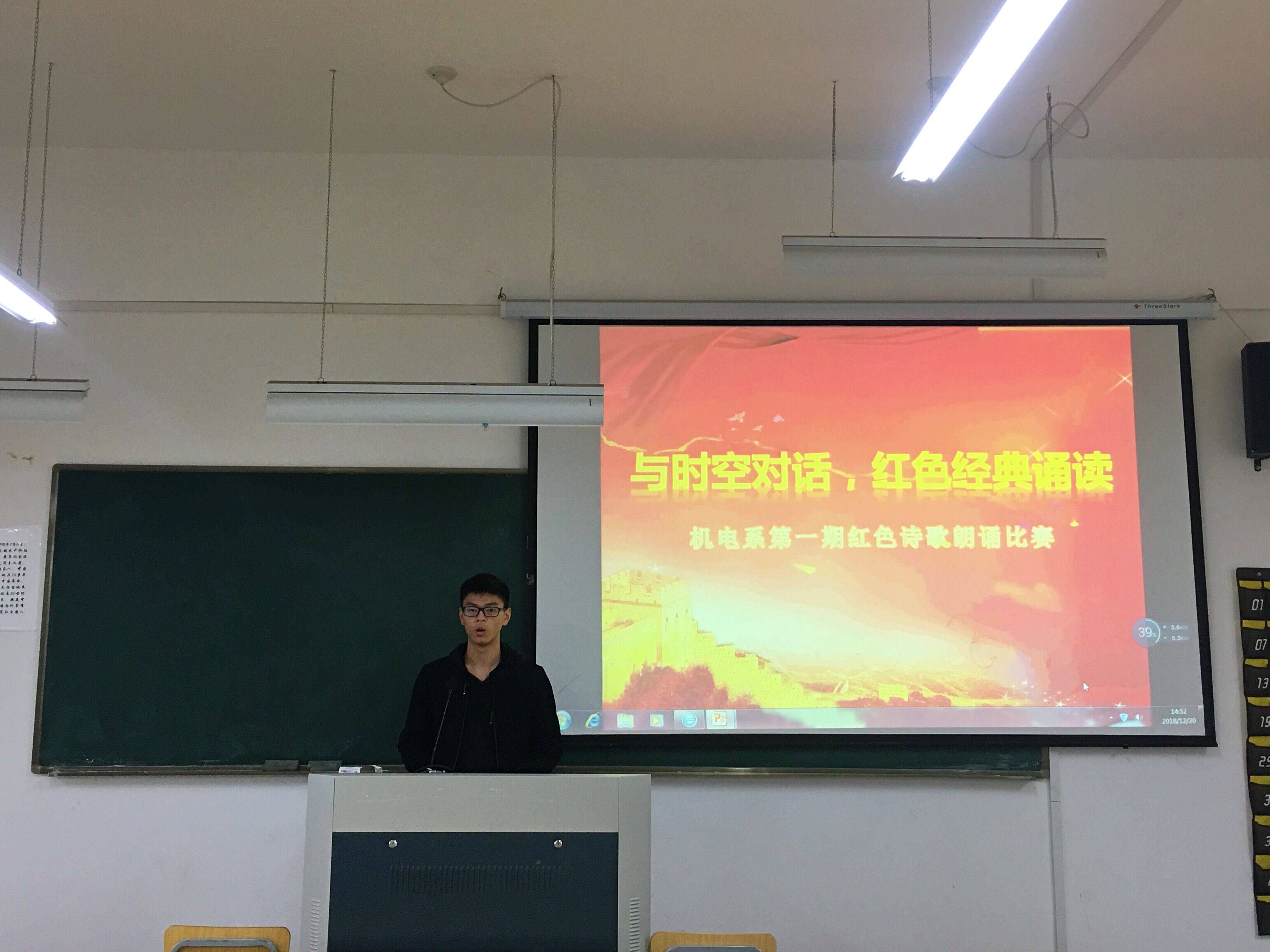 为纪念改革开放四十周年,激发全体同学以饱满的热情歌颂祖国、歌颂党、歌颂改革开放,充分展现“机电人”不忘初心、牢记使命的精神风貌。12月20日,机电系举办第一期“与时空对话,红色经典朗读”比赛,得到了同学们积极的响应,共有44位同学参加本次比赛。