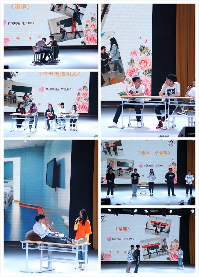 随后,各参赛队伍结合自己的生活经历和思考感悟,从大学生活的不同话题入手,演绎成长过程的不同经历。各班表演贴近生活,各具特色,引起了在场同学的共鸣。最终,建工1801班、市政1802班、建工1802班、造价1803班、建工1803班、市政1801分别获得一、二、三等奖。
