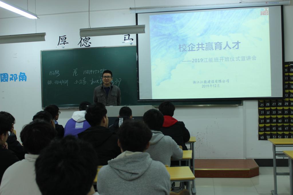 12月18日下午,2019级江能班开班仪式在钱江楼306顺利举行。机电系领导、浙江江能建设有限公司副总经理周奇、2019级江能班班主任、全体学员等参加开班仪式。仪式由机电系办公室主任石杨主持。