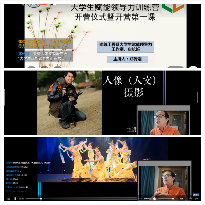 在自媒体时代,人人都是宣传员,为了让大家在开展活动的时候学会怎么样找好角度,去拍摄会说话的新闻图片,增强同学们的宣传意识,提高大家的拍摄技巧,温州市人像摄影家协会会员余帅帅老师为学员直播分享以镜头之故事,绘青春之多彩——人像摄影入门,余老师从拍摄前拍摄地的寻找、与被拍摄人的沟通要点、拍摄的角度和拍摄的小窍门等角度等方面进行讲解,建工系300余名学员前来听课并积极互动。