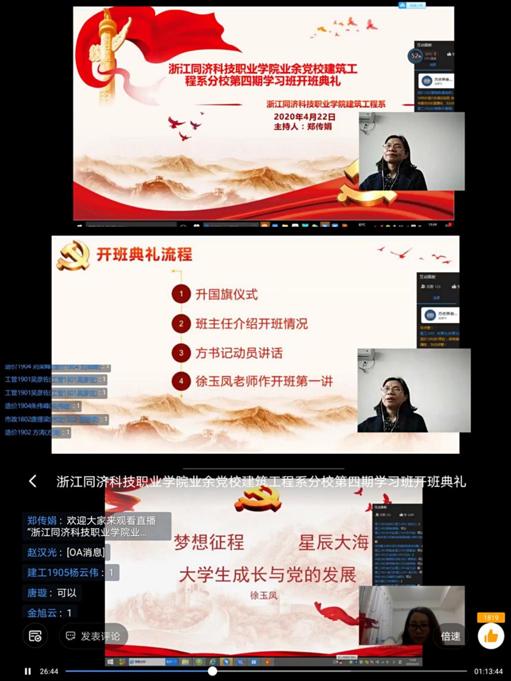 为深入贯彻习近平总书记关于新冠肺炎疫情防控的重要讲话精神,建工系采用入党积极分子培训班“云”开班典礼及线上授课模式,扎实做好疫情防控期间党员发展工作。4月22日下午,建筑工程系第4期党校培训班开班典礼如期在钉钉网络直播平台启动,建工系党总支书记方志英老师、学生党支部书记徐玉凤老师、学生党支部组织委员王楠楠老师出席开班典礼。全体学员通过观看钉钉直播参加了本次开班典礼,仪式由学生支部宣传委员郑传娟主持。