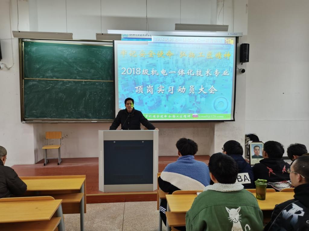 1月6日下午,机电系在钱江楼c103教室召开2018级机电一体化技术专业、电气自动化技术专业学生顶岗实习动员会。机电系领导孙连栋副主任、相关专业部老师、学生参加了动员大会。大会由机电一体化技术专业部主任蒋帆主持。