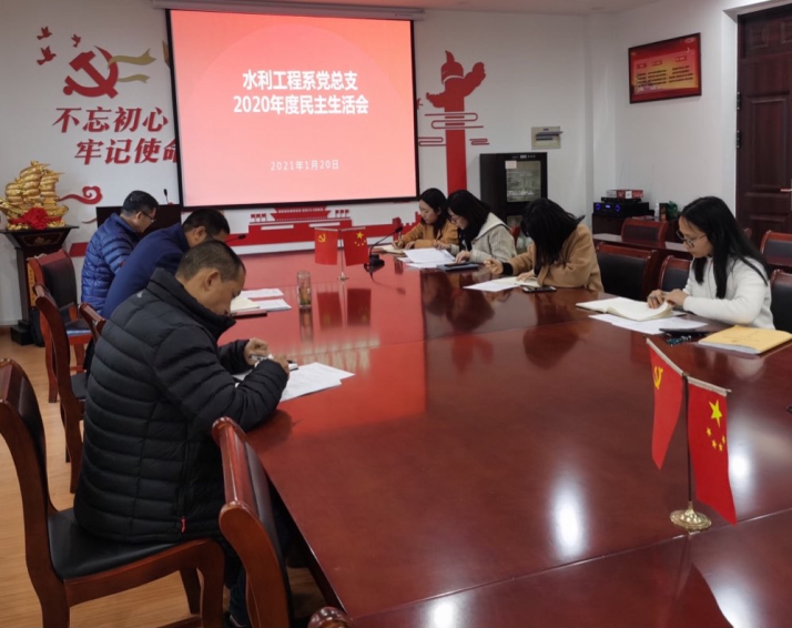 1月20日,水利系党总支领导班子召开2020年度民主生活会,学院党委副书记、副院长吴宏平与组织部相关工作人员出席会议。会议围绕认真学习贯彻习近平新时代中国特色社会主义思想,加强政治建设,提高政治能力,坚守人民情怀,为夺取决胜全面建成小康社会、实现第一个百年奋斗目标的伟大胜利,开启全面建设社会主义现代化国家新征程这一主题,紧密联系水利系党总支工作实际,进行自我检查、认真开展党性分析,开展批评和自我批评。