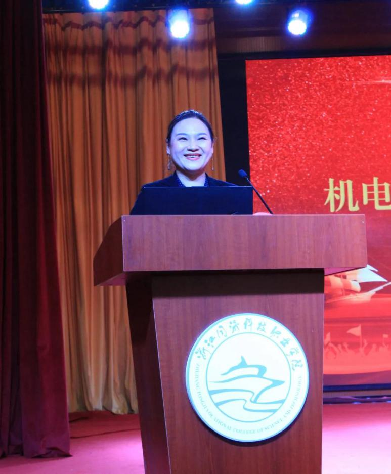 机电工程学院党总支副书记章卉致辞,她说:“居初心者,单纯快乐;居雄心者,踌躇满志;居匠心者,勤勉不懈”。她激励机电学子要如匠人那样有情怀、有态度、有信仰,能够对自己所作的事坚持、投入、不忘初心,不改初衷,精益求精。