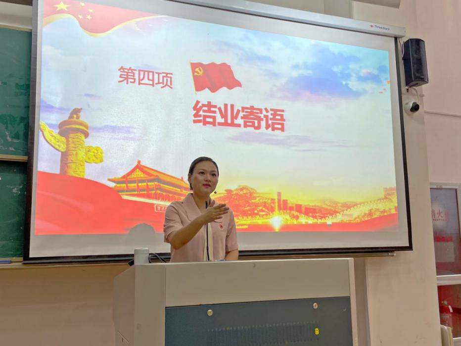 学生党支部组织委员胡馨予为全体学员颁发了结业证书,并送上学生党支部制作的《入党积极分子、党员成长手册》,给学员们介绍了成长手册的内容及入党积极分子培养的“六个一”工程要求,鼓励大家完成好成长手册,早日成为中共党员。
