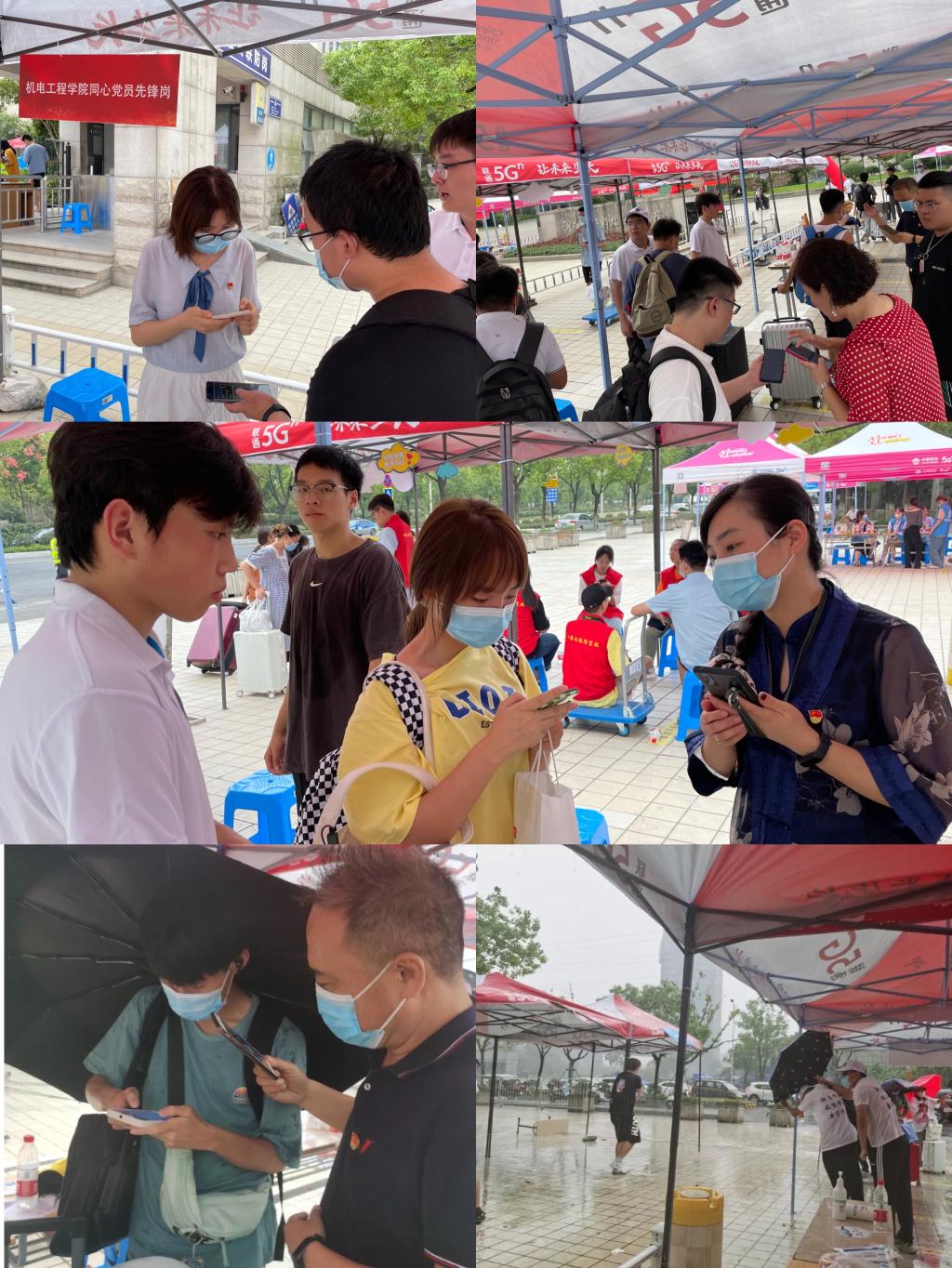 上午虽然烈日炎炎,但党员教师们对志愿活动仍然充满热情。在总支副书记章卉的带领下,党员教师们早早来到校门口。经过短暂的培训后,教师志愿者们很快到达各自岗位开展志愿服务活动,有的负责维护排队秩序,有的引导学生出示行程码、返校码,有的负责核验通行证录入体温……