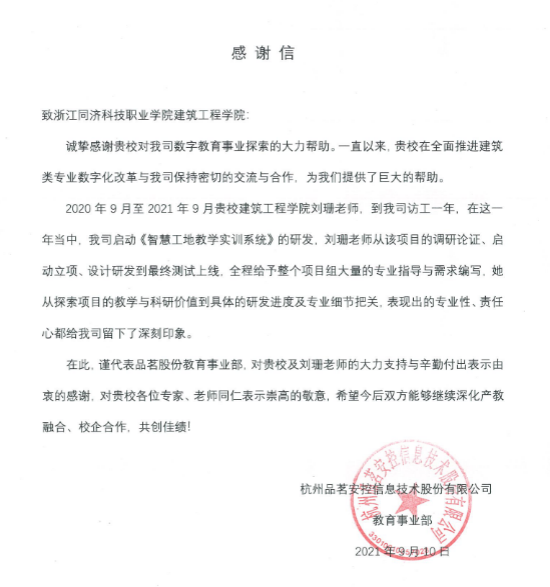 杭州杭州品茗安控信息技术股份有限公司特寄来感谢信,对学院以及刘珊老师的大力支持与辛勤付出表示由衷的感谢,希望今后双方能够继续深化产教融合、校企合作。
