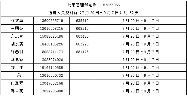 1、暑假期间,学生公寓停止使用。封门时间:2016年7月4日12:00---2016年9月9日,请同学们提前做好离校准备工作。学生在离校期间,不要在公寓内存放现金和笔记本电脑等贵重物品。公寓具体值班人员安排如下: