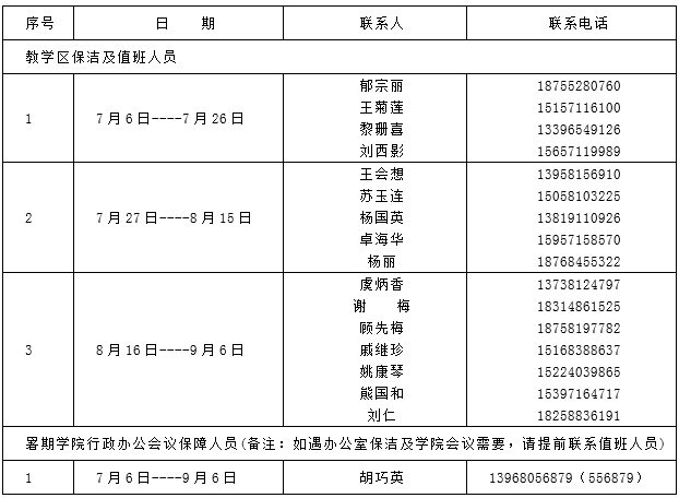 2、暑期保洁、杂务、及教学其开关门值班人员安排。教学区域7月6日起开始实行东主通道出入,早晚开关门管理。其他通道封闭。早上 7:00开门,下午时5:00关门,周日及其它时间段请联系开关门值班人员邹永明,联系电话:长号:13967124705,短号:664705。