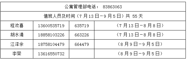 1、暑假期间,学生公寓停止使用。封门时间:2015年7月10日12:00---2015年9月7日,请同学们提前做好离校准备工作,个别学生确因特殊原因需推迟离校,按《关于做好暑假留校学生住宿管理的通知》办理。学生在离校期间,不要在公寓内存放现金和笔记本电脑等贵重物品。公寓具体值班人员安排如下: