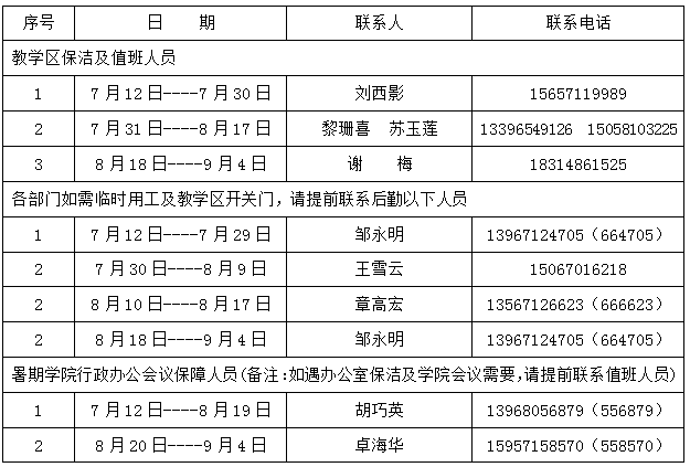 2、暑期保洁、杂务、及教学其开关门值班人员安排。教学区域7月12日起开始实行东主通道出入,早晚开关门管理。其他通道封闭。早上 7:00开门,下午时5:00关门,周日及其它时间段请联系开关门值班人员(注:7月12日至29日邹永明,7月30日至8月9日王雪云,8月10至17日章高宏,8月18日至9月4日邹永明)