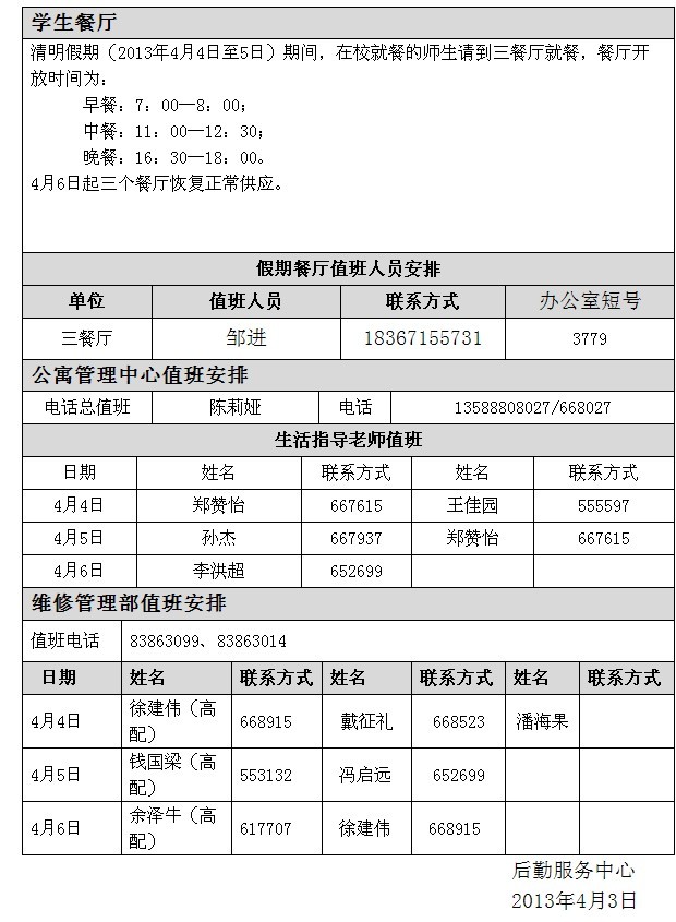2013年清明节后勤服务保障一览表