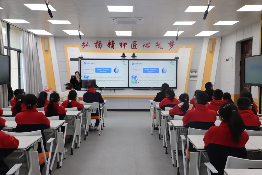 本次活动首先在智慧教室A519拉开序幕,阮红芳院长对万向小学鲍校长一行师生来院参与活动表示热烈欢迎。她希望在“大中小学思政课一体化”进程中,同科马院和万向小学携手共进,在课程建设、实践育人,师资共建等方面建立长效机制,共同推进思政育人工作。随后,由马院高翔教师进行了思政微课的讲授活动。高翔教师从世界水日的由来、水资源的重要性等方面娓娓道来,又深刻地讲述了“浙水”滋养出的“地瓜经济”以及如何让更多的人品尝到浙江又大又甜的共富之瓜。现场师生认真聆听,收获满满,时时响起热烈掌声。最后,鲍东升校长对微课讲授及本次推进活动给予了高度赞扬,表示希望双方以后能够加深交流,增强育人实效。
