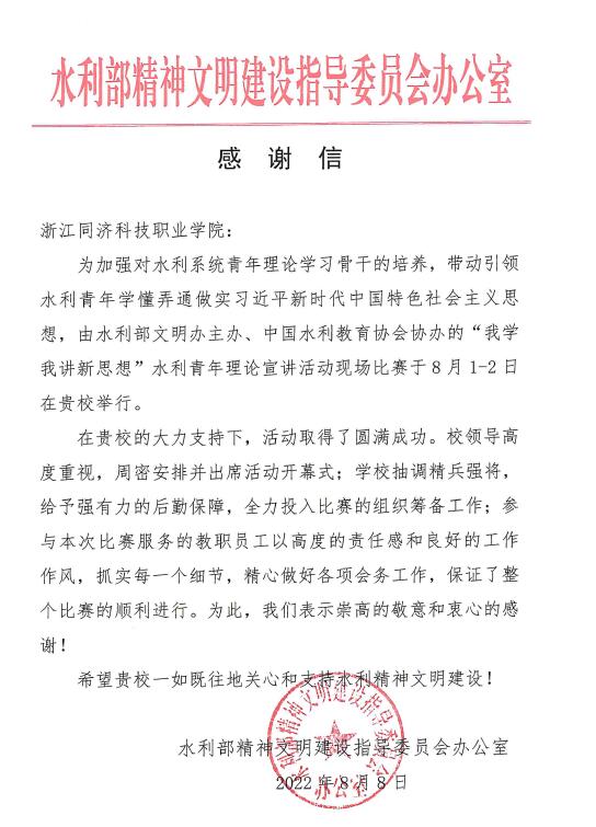 8月8日,水利部精神文明建设指委员会办公室向我校发来感谢信,感谢我校对“我学我讲新思想”水利青年理论宣讲活动现场比赛的大力支持。